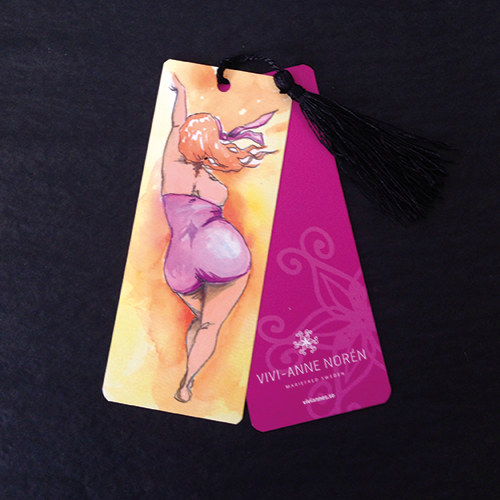 Bokmärkena har tryck på fram- och baksida och har producerats på ett miljövänligt material som är avtorkningsbart. Levereras med en silkestofs i matchande färg.