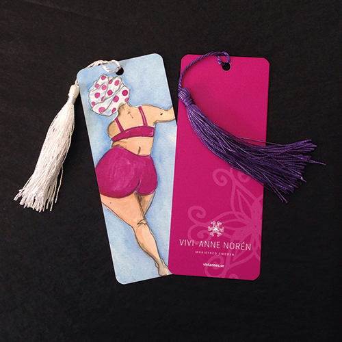Bokmärkena har tryck på fram- och baksida och har producerats på ett miljövänligt material som är avtorkningsbart. Levereras med en silkestofs i matchande färg.